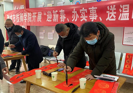 山东新闻网:(刘延栋  吕英杰)春节是中华民族祈福迎祥的传统节日,贴春联则是中国人过春节的文化传统之一,写春联,送喜庆,更是弘扬中华民族优秀传统文化的良好形式。1月29日,山东省聊城市市直书画家协会技师学院分会的几名书法家与聊城市技师学院工会的领导们一起来到九州国际社区和金柱东苑小区开展了“迎新春,办实事,送温暖”主题活动,希望通过这种形式,让更多群众感受春联的魅力,营造新春喜庆祥和的气氛。