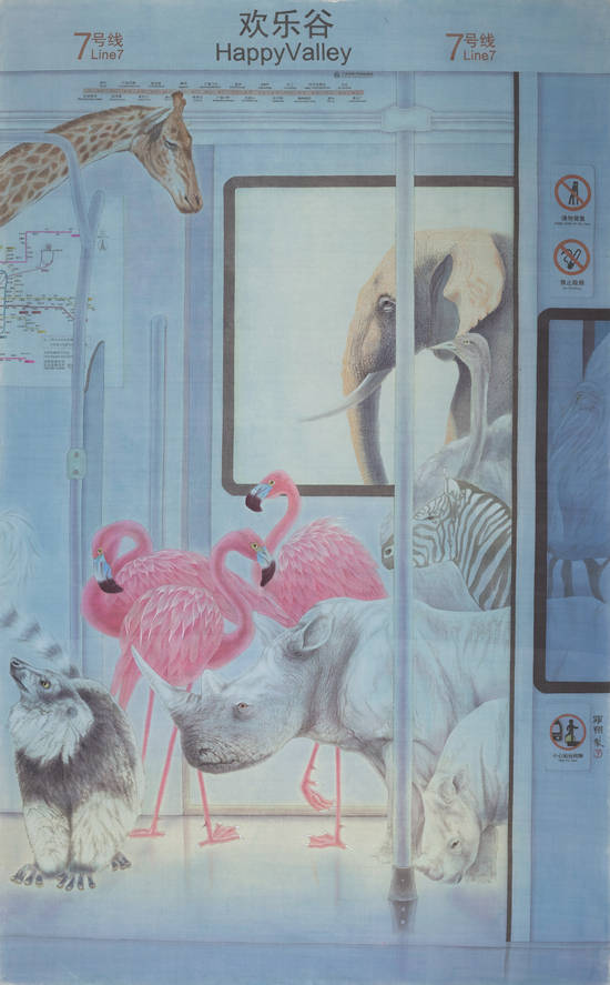 《欢乐谷》似乎在用动物世界的眼光来考量人类,这种图像创造的意味并不是对人类创造的物质文明的欣赏。因为人类在用现代文明隔离与自然的亲和关系,正像人类在居住的城市通过制造“欢乐谷”来豢养动物、观赏动物一样,人类也在用自己创造的现代文明将人类自身圈养起来。或许,在动物看来,这其实才是被他们观看的一个“欢乐谷”。这幅作品显然不同于以往所有的花鸟画、人物画,而是以图像再造设计了一个离奇的情境,画面固然是优美的,但画作直击人们内心的却是比这种优美更加深刻的思想和观念。地铁是当下中国城市发展中最具鲜明科技和机械制造特征的生活空间,但恰恰是这个科技空间却到处充满了动物的嬉戏、漫步、伫立和凝视。这个空间设计显然是画家的图像创意。