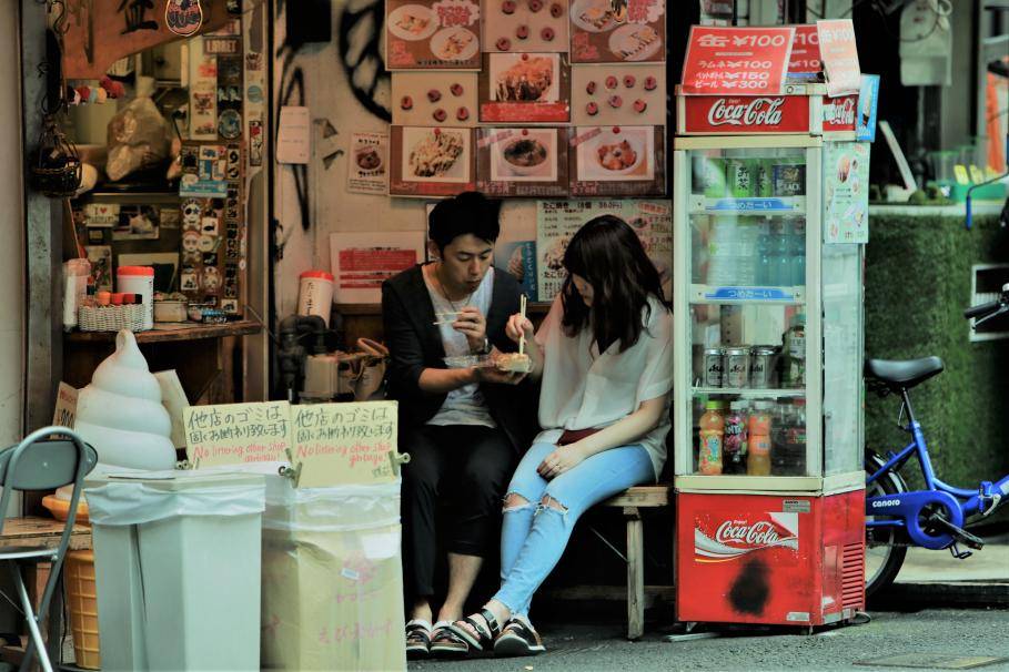 日本,一对年轻的夫妻在自家的店铺里忙碌了一个上午,午餐只是一盒小小的盒饭。男人用一只手端着,两人一边说着话一边你一口我一口的吃着。只要有爱,小小的盒饭就足以撑起一个家庭风雨兼程。