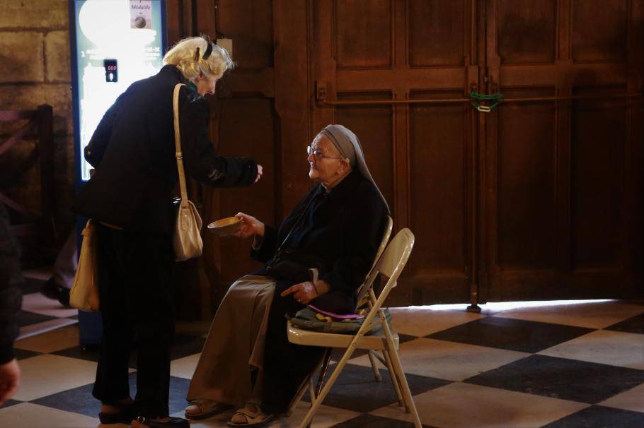 年迈的嬷嬷,圣母般地坐在教堂的大门里,夕阳通过高大的教堂玻璃彩色花窗撒在老嬷嬷的脸上,既温暖又慈祥。常年的劳作使得她腿脚已经衰老,但她坚持一天天地坐在那里,信仰的力量让她一定要为人们做点什么,因为她坚信,服务社会大众就是服务上帝。