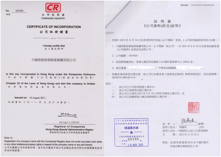1,中国焦点新闻报业集团有限公司是一家注册于香港的新闻媒体公司,注册编号:1657020,无论通过企查查、天眼查还是到香港政府企业注册处查询,我公司都是至今仍然在正常运行,每年都正常年检、交税,是一家合法公司(香港政府企业注册处查询网址:https://www.icris.cr.gov.hk/csci/)。2015年11月,司法部委托的香港律师机构还曾专为该公司出具证明文件,并加盖了司法部的专用公章,证明该公司是合法存在的香港新闻机构。中国焦点新闻网是该公司旗下的新闻网站,至今已经运行了13年之久,尽管有人称其为民间网站或个人网站,但截至到目前,中国大陆没有任何一家机构能够证明该公司是一个非法机构,其所办的网站中国焦点新闻网是一家虚假网站,而司法部的权威证明文件却能够证明该公司是合法存在的公司,所以淄博文旅局称赵某假冒记者是错误的。