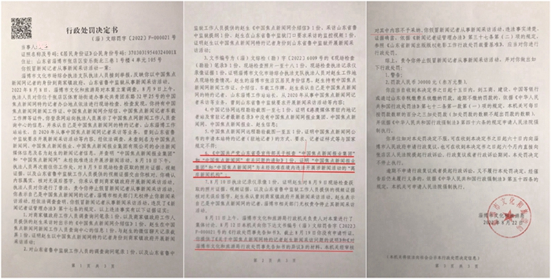 本站讯 2022年8月22日,山东省淄博市文化和旅游局(以下简称淄博文旅局)针对中国焦点新闻网特约记者赵某做出处罚决定书([淄]文综罚字[2022]F—000021号),以赵某假冒记者采访为由,决定对其罚款三万元人民币,并责令其停止假冒记者从事新闻采访活动。此事立即在媒体圈内引发强烈反映。