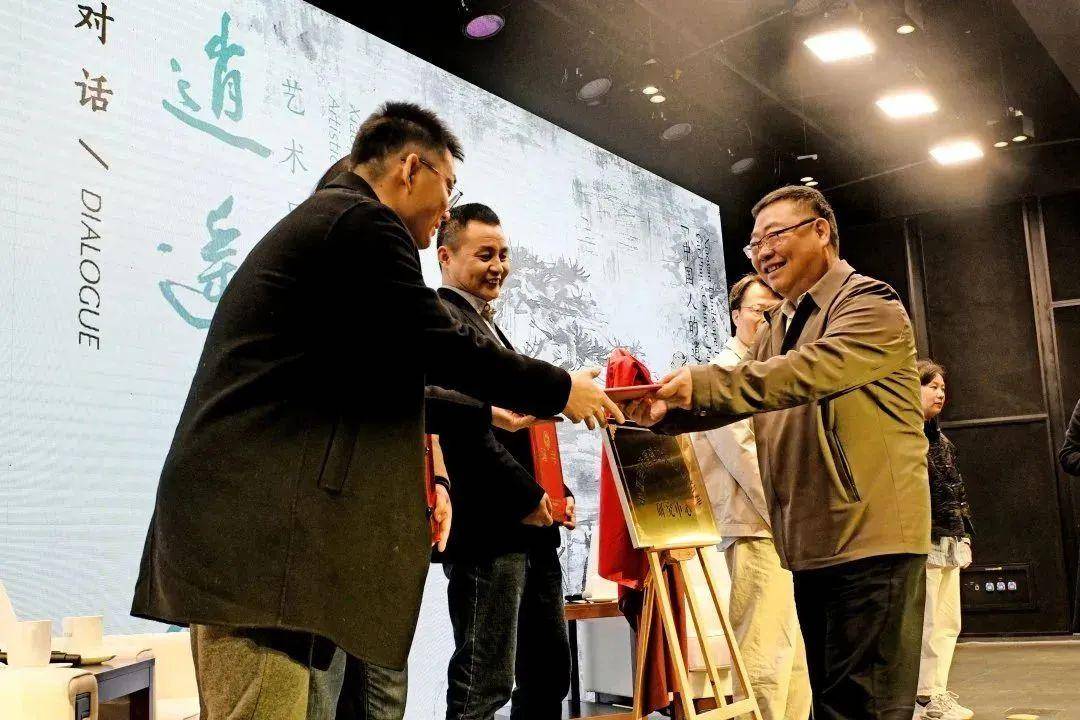 开幕式前,江苏省社会科学院党委委员、副院长、南京大学哲学系、中华文化研究院教授、博士生导师王月清,上海社会科学院原副院长、研究员、南通大学长三角现代化研究院院长、首席专家、中国浦东干部学院特聘教授上海文化研究中心首席专家何建华与顾平进行了一场艺术对话,就“逍遥山水”的艺术解读和现实意义展开了互动交流。对话活动后,还成立了南通大学现代化研究院“中国当代逍遥山水与人文精神研究中心”,何建华、顾平为中心揭牌,南通大学经管学院院长、长三角现代化研究院执行院长、首席专家姜朝晖为中心新聘任的六名研究员颁发聘书。