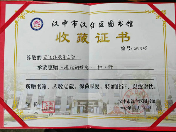 2023年7月31日,由西北建设杂志社出版的大型画册《崛起的辉煌——陕西城市建设20年成果汇编》被汉台区图书馆收藏,该馆馆长朱鹏飞向杂志社颁发了收藏证书,对杂志社的辛勤付出表示感谢,并表示该馆将会精心保存画册,编制索目,便于读者查询、借阅。