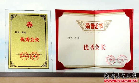▲劳嘉总裁荣获“湖南省工商联女企业家商会优秀会长”证书