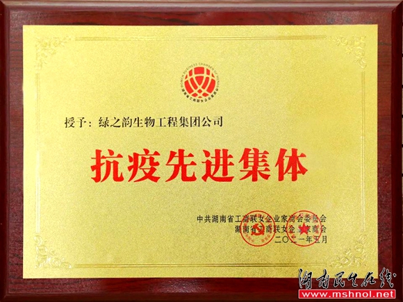 ▲绿之韵集团荣获“湖南省工商联女企业家商会抗疫先进集体”